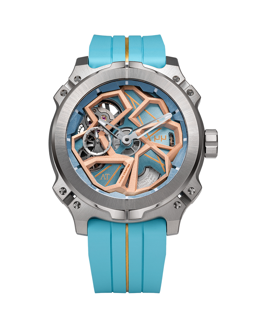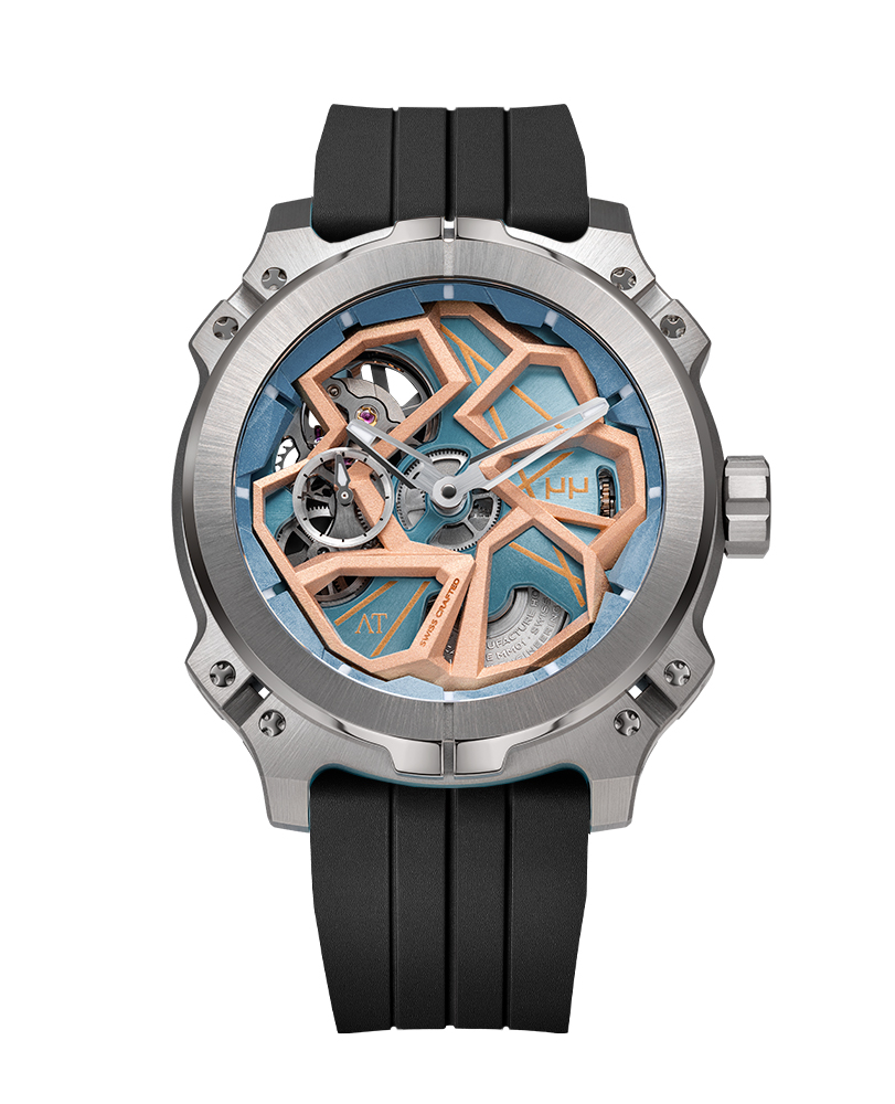 Cette collaboration entre Christophe Musy et Arturo Tedeschi révèle l'âme mécanique à travers le calibre MM01. Ce mouvement squelette « Swiss Crafted » de 167 composants s'expose sans artifice, affirmant que la fonction dicte la forme. Pas de décoration superflue : seule la vérité du mouvement automatique et sa réserve de marche de 55 heures participent à l'équilibre visuel. Le résultat est une déclaration d'innovation pure, mariant l’artisanat suisse à la précision avant-gardiste de la créativité computationnelle.